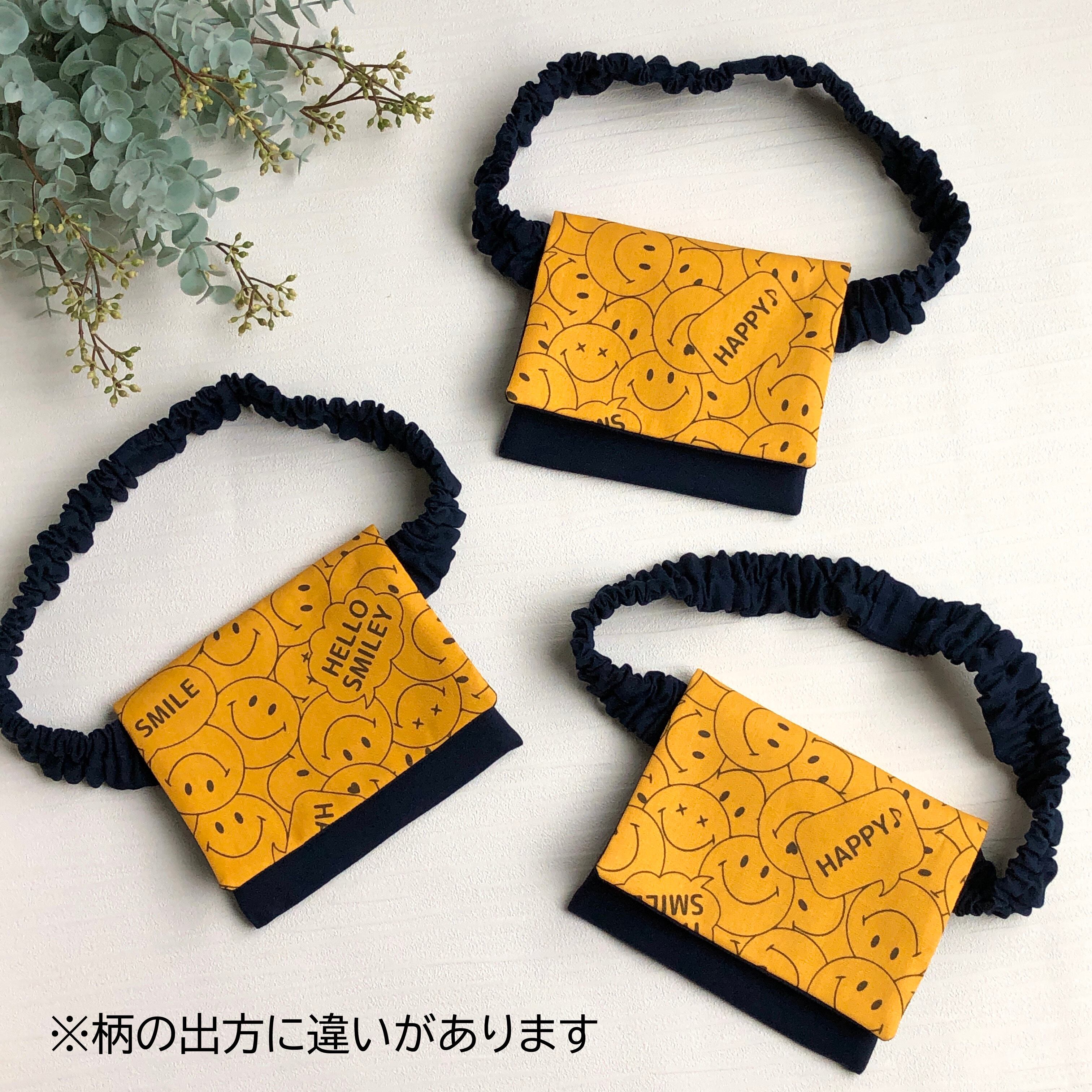 ふたにはスタイリッシュなスマイル柄の生地、別布には紺色の生地を使い、