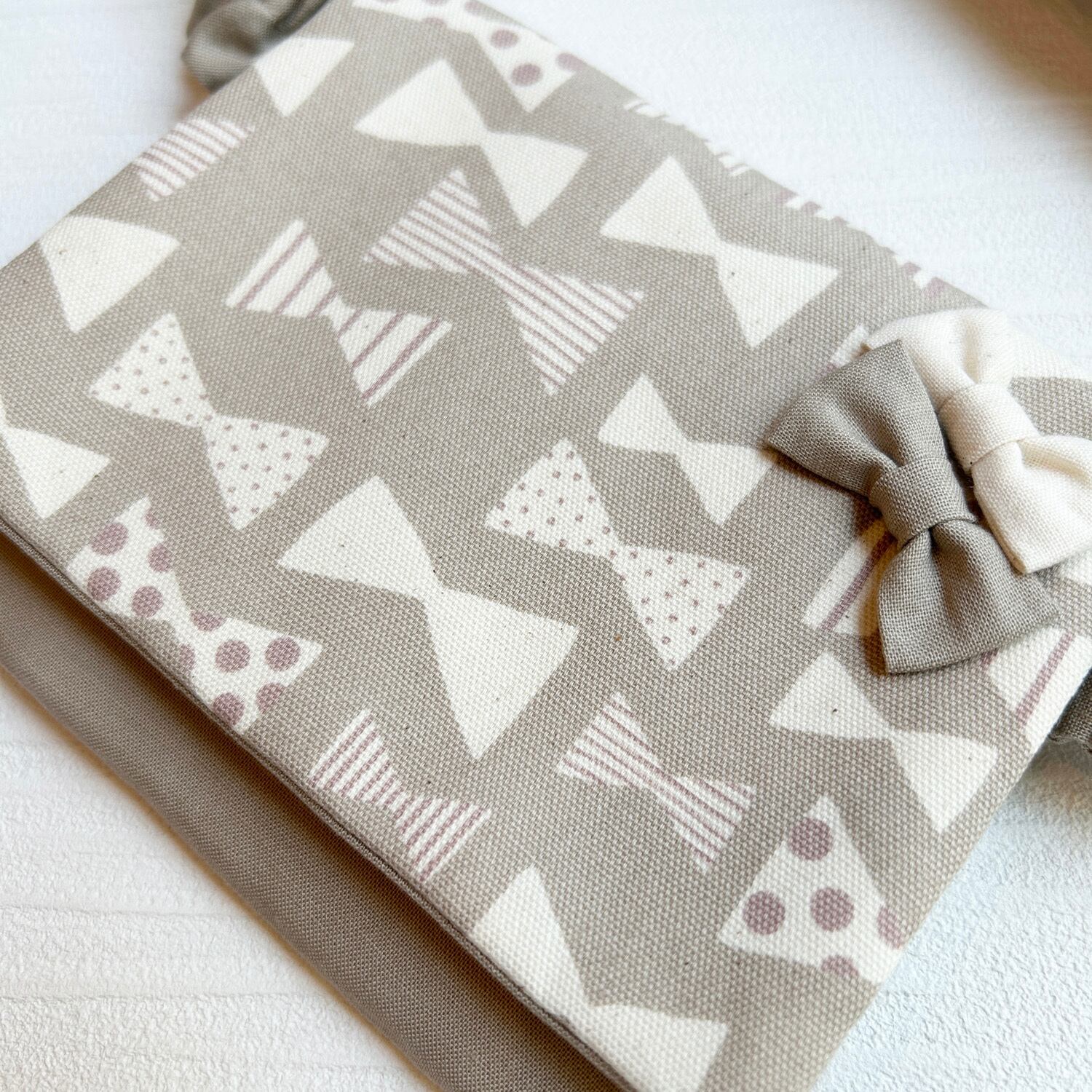 スモーキーな色合いのリボン柄に合わせて、グレーがかったベージュ(グレージュ)の無地の生地を合わせました。