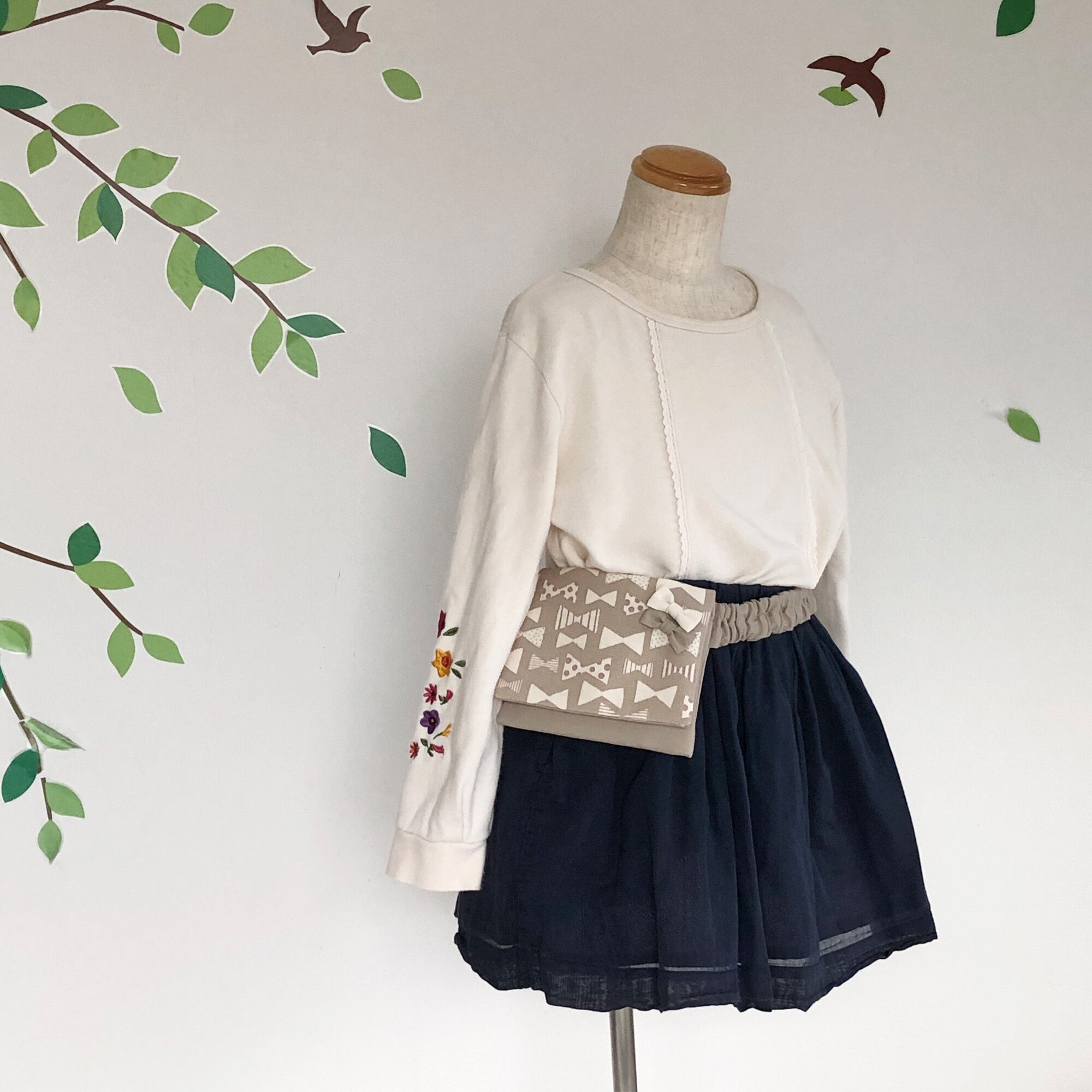 とても可愛らしいリボン柄なので、リボン柄と馴染むようにグレージュとオフホワイト(カス残し)のリボンをアクセントに付けました♪