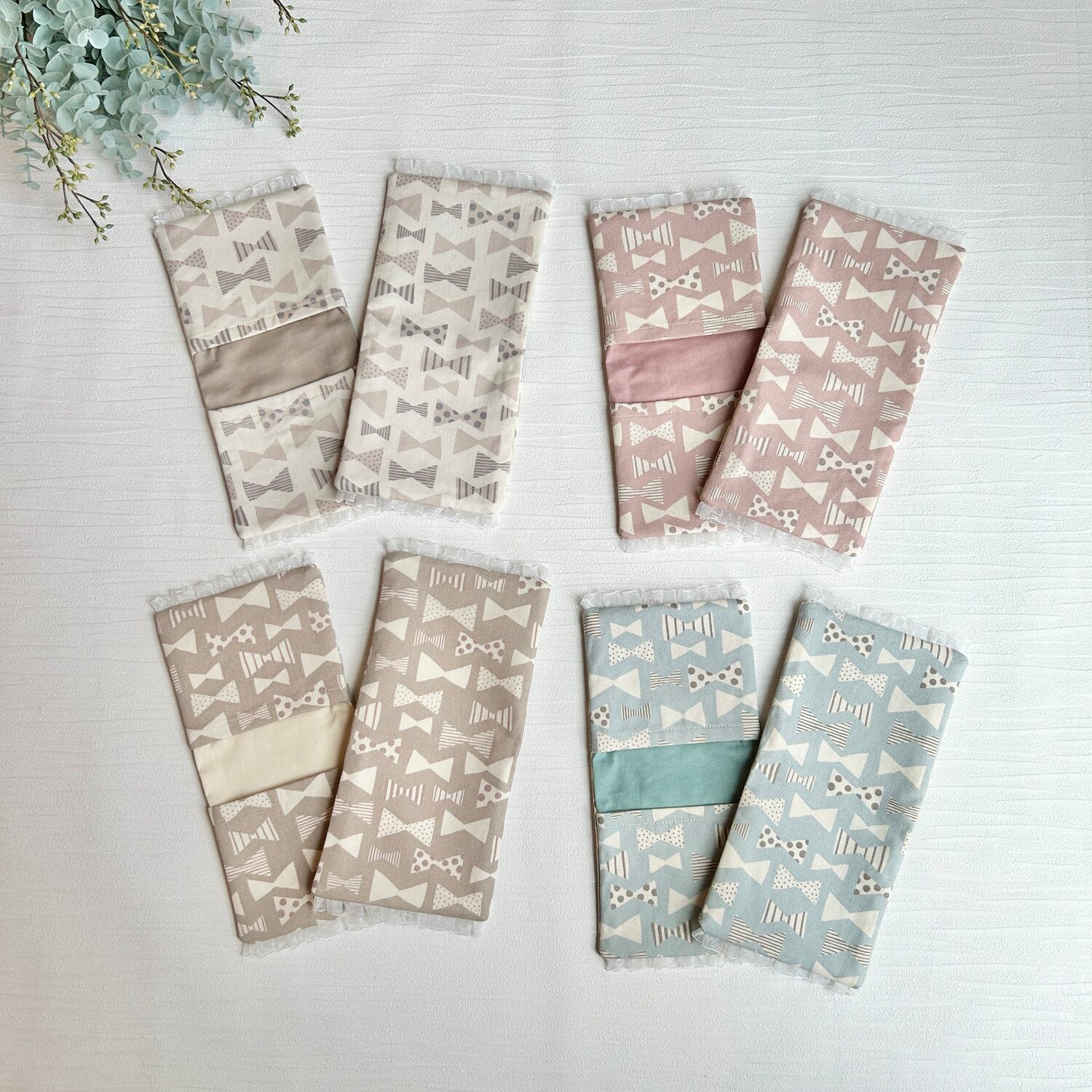 くすみカラーが可愛いリボン柄の生地に、少しキラキラした素材のフリルレースを付けたので、可愛い雰囲気の好きな女の子におすすめです♪